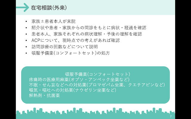 自院でされている在宅相談の流れについて紹介。特に病院と異なる部分は、頓服予備薬(コンフォートセット)であり、いつでも検査や治療が行える中核病院とは違い、予め起きうるものについて想定し備えることが在宅では重要になってくる。そのためには正しく病状を理解し、本人・家族との十分な話し合いを設けることが重要であり、病院診療とのギャップを大きく感じるところであり、在宅への抵抗感や難しさを感じやすい部分である。
